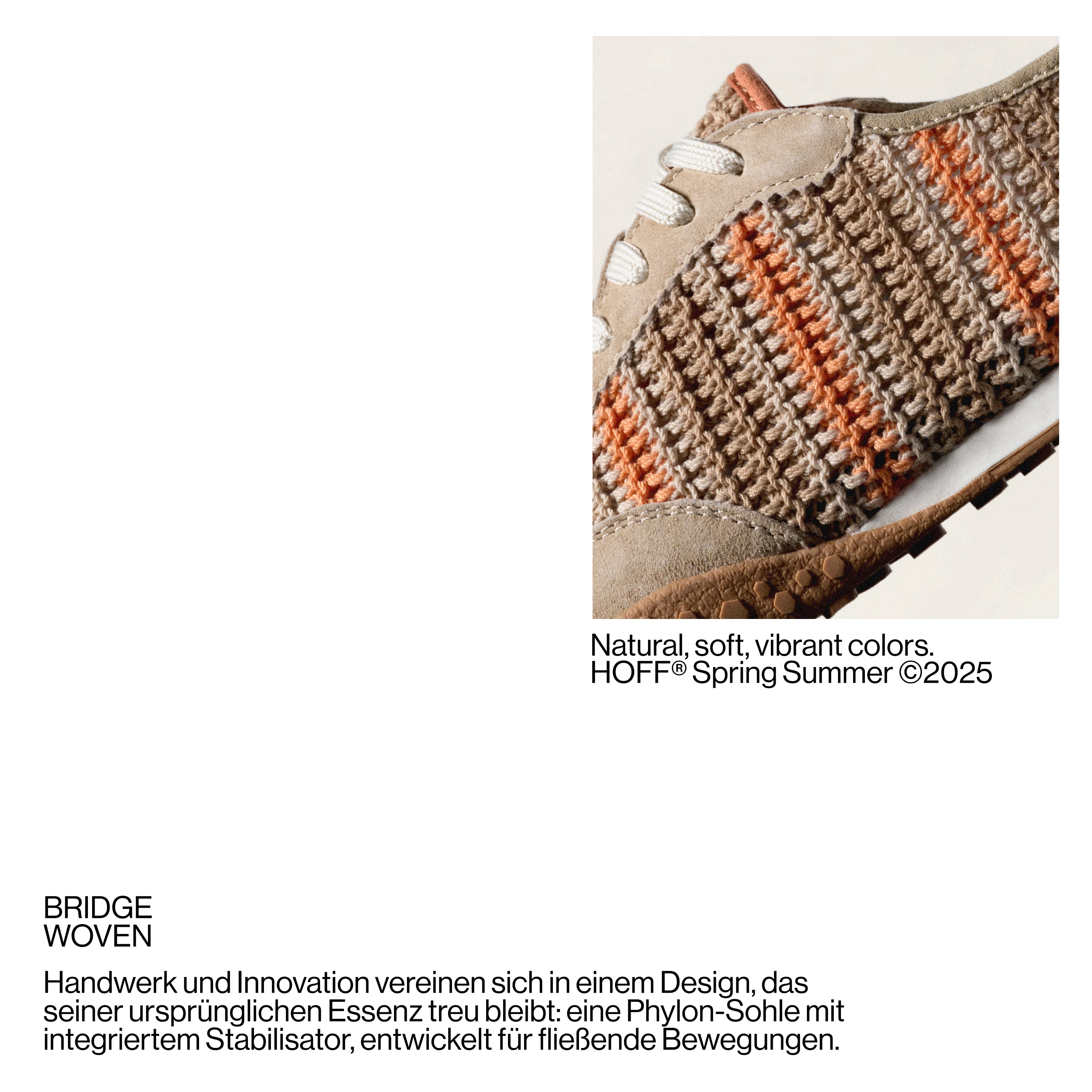Die Bridge-Silhouette, neu interpretiert mit handwerklichem Flair. Entdecke Bridge Woven: vier Modelle unserer ikonischen "Ballet Runner", jetzt in leuchtenden Farbkombinationen und feiner Häkeloptik.